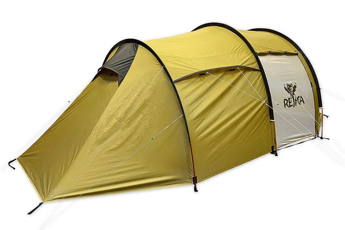 Rejka vereint in dem kompakten Familienzelt Antao IV Camp Robustheit und Komfort. Das 3-Bogen-Tunneldesign schafft vor der Schlafkabine einen Vorraum zum Wohnen bei schlechtem Wetter und ermöglicht zugleich einen schnellen, unkomplizierten Aufbau, bei dem das eingehängte Innenzelt komplett wettergeschützt ist. Unterstützt wird die einfache Handhabung beim Aufstellen des 180 cm hohen Zeltes durch das geringe Gewicht der stabilen 11-mm-Gestängebögen, die zur besseren Orientierung, ebenso wie die Gestängekanäle, farbcodiert sind, so dass sofort klar ist, wohin welcher Gestängebogen gehört. Die direkt an den Gestängekanälen befestigten Abspannleinen stabilisieren das Gestänge sehr unmittelbar und effektiv und tragen damit dazu bei, dass das Antao IV Camp trotz seiner großen Zeltflächen außerordentlich windstabil ist. Rejka hat dem 4-Personen-Familienzelt zudem sehr widerstandsfähige Beschichtungen an Außenzelt und Boden mitgegeben, die für langlebige, zuverlässige Wasserdichtheit sorgen. Die Belüftung erfolgt über vier große Dachlüfter und bei gutem Wetter zusätzlich über die seitliche Eingangstür in den Vorraum, die auch mit einer Moskitonetz-Tür verschlossen werden kann. Das leichte Antao IV Camp ist auf Grund seines intuitiven, schnellen Aufbaus ein Zelt für kleine Familien, die im Urlaub mobil sind und öfter den Standort wechseln, dabei jedoch den Komfort eines stehhohen Zeltes mit geräumigem Vorraum nicht missen möchten.