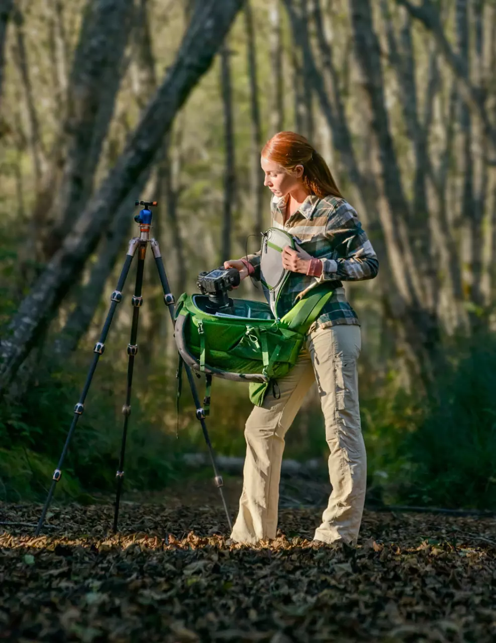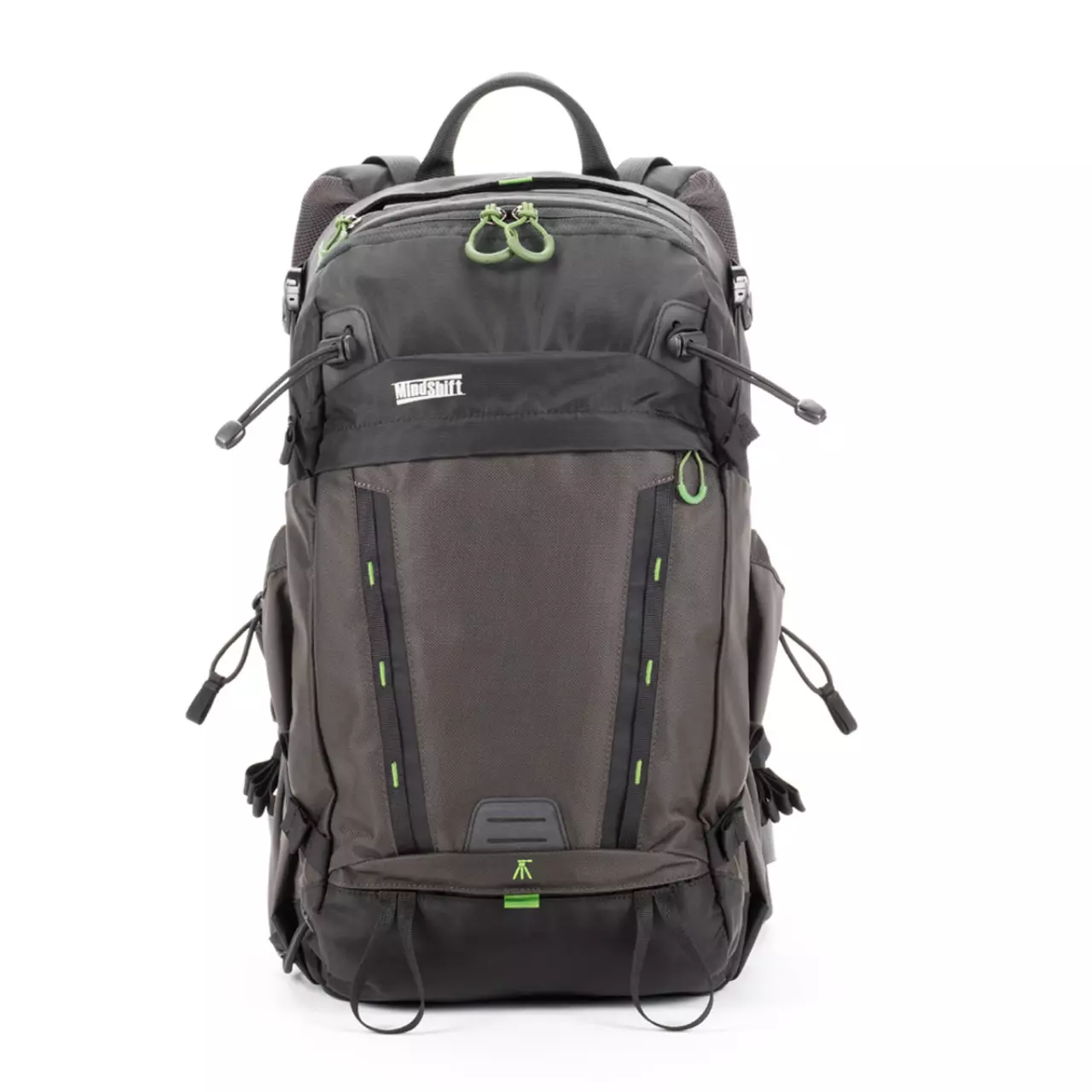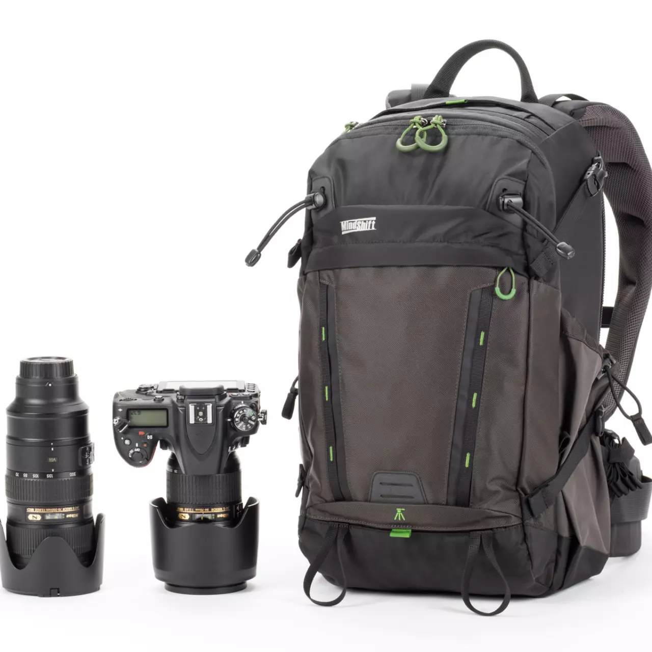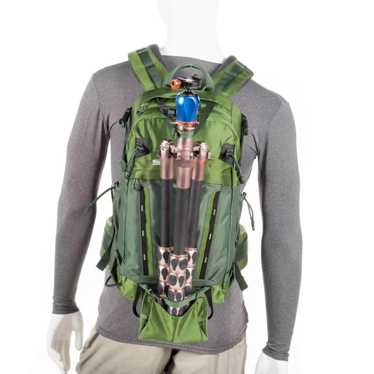 - Die Verwendung des MindShift Gear Tripod Suspension Kit (Zubehör) ermöglicht den Transport eines Stativs in Arbeitsposition.