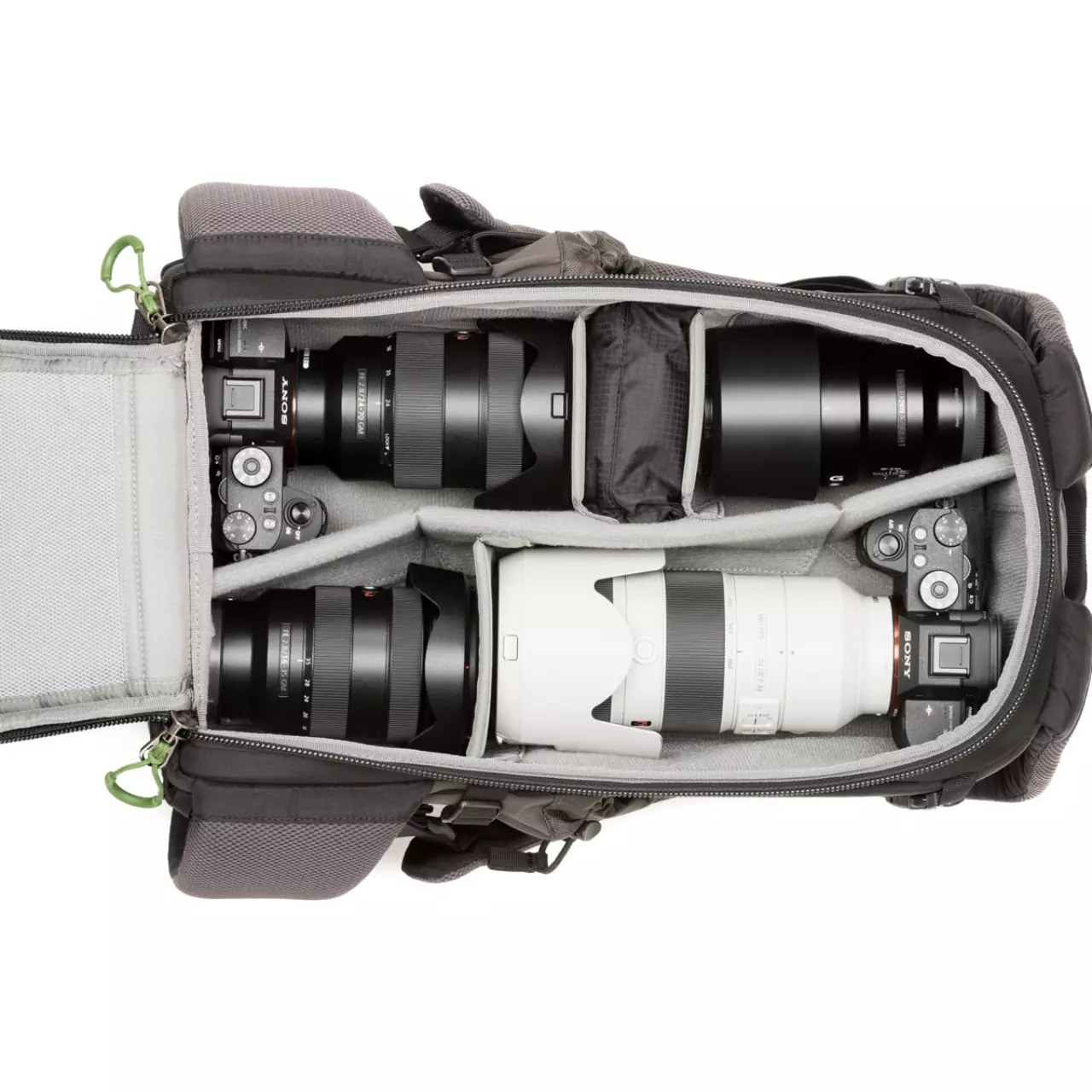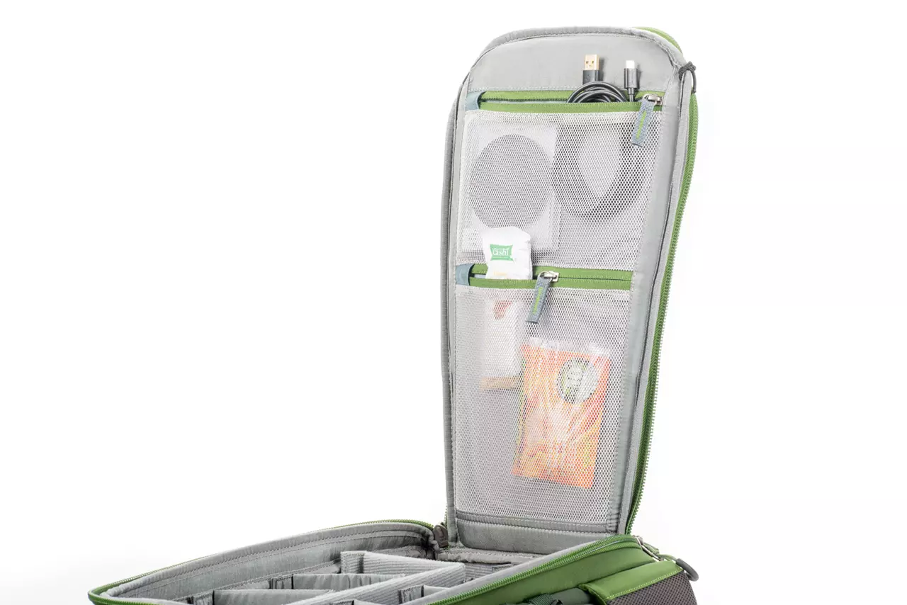 - Netztaschen auf der Innenseite des Rückenteils für Filter, Kabel, Akkus usw.