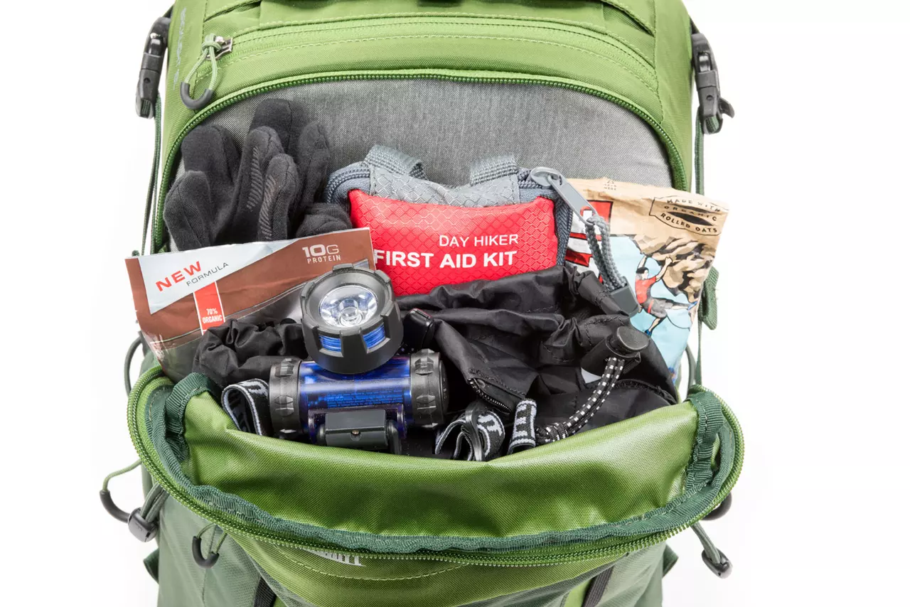 - Komprimierbares Vorfach für z.B. eine dünne Jacke, die zweite Bekleidungsschicht, Mütze, Handschuhe, Stirnlampe und Verpflegung.