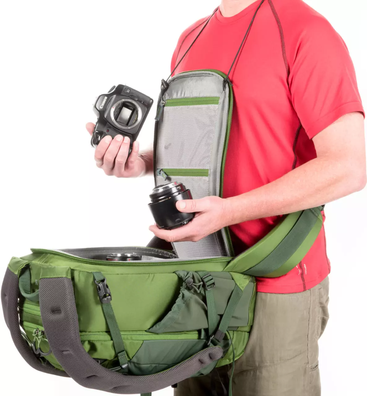 - Ein in der Länge verstellbares Band zum Umhängen hält das geöffnete Rückenteil vor dem Oberkörper und bietet so ungehinderten beidhändigen Zugang zur Ausrüstung.