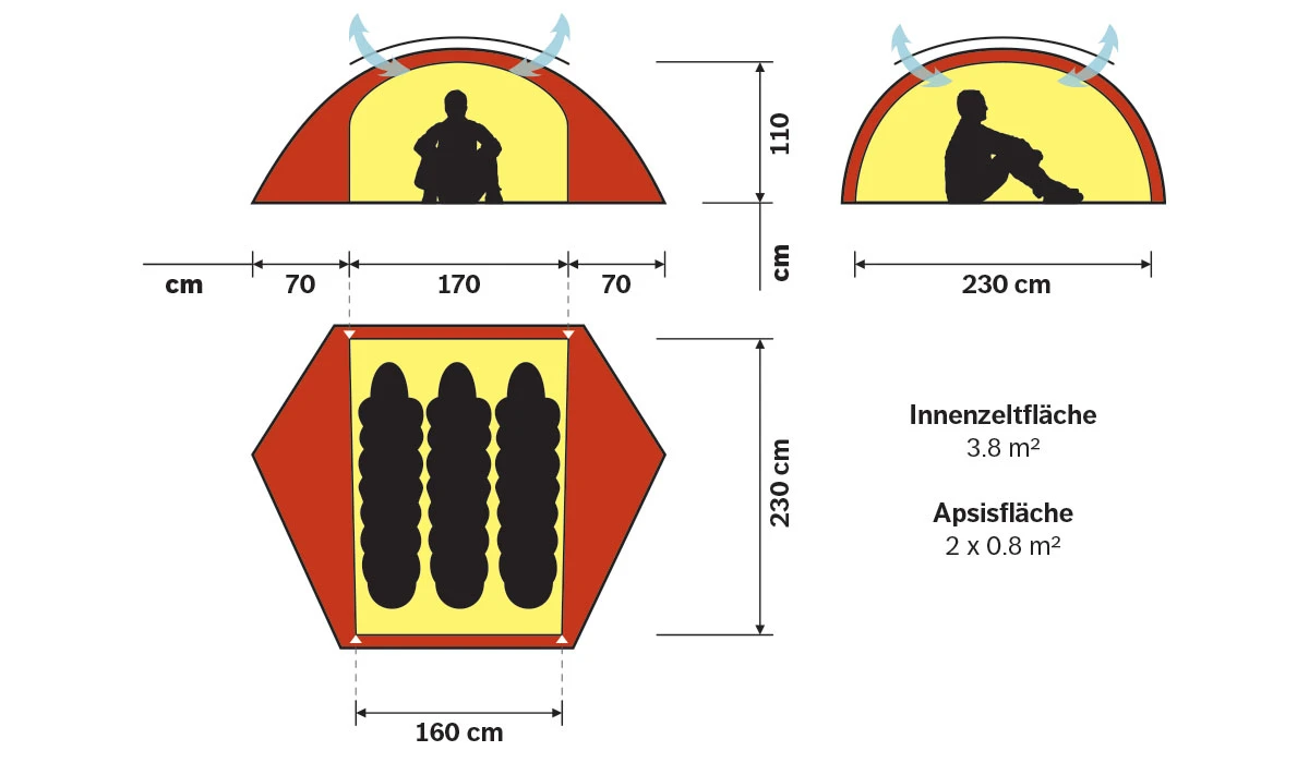 - 2 gegenüberliegende Eingänge mit je einer geräumigen Apsis für Gepäck