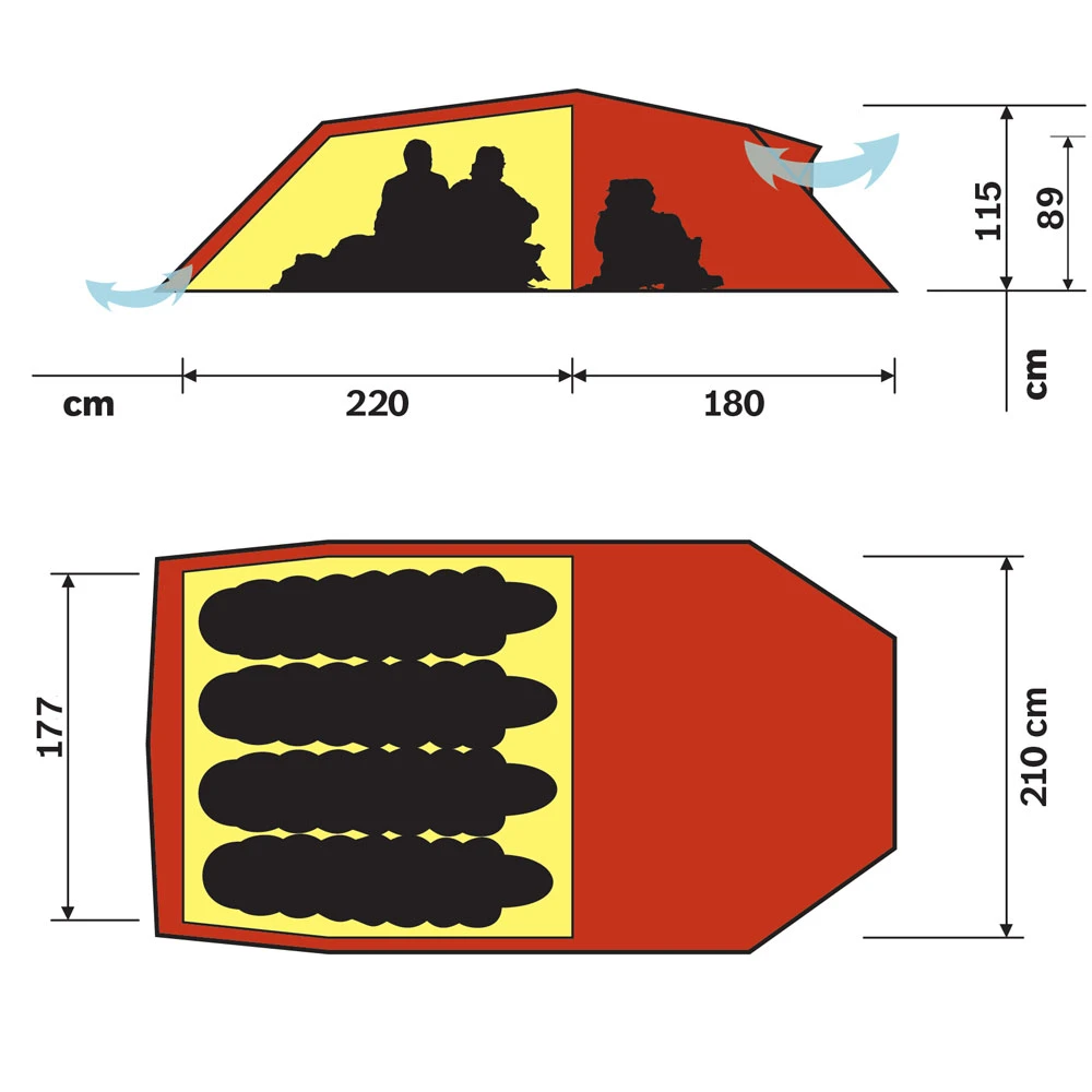 - leichtes und geräumiges 3-Bogen-Tunnelzelt für 4 Personen