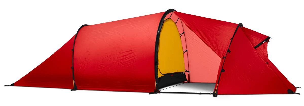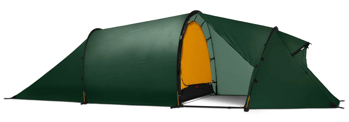 Ganzjahrestauglichkeit, geringes Gewicht und viel Platz für 4 Personen bietet das Hilleberg Nallo 4 GT. Ein dritter Gestängebogen sorgt bei diesem Tunnelzelt für die große Apsis, die ideal für viel Gepäck, den Hund oder zum Kochen an Schlechtwettertagen geeignet ist. Das Nallo 4 GT verfügt über 2 Eingänge, einen großen verschließbaren Lüfter und einen Bodenlüfter am Fußende. Es ist für den ganzjährigen Einsatz geeignet und dabei mit 3,6 kg auch auf Trekkingtouren noch ein echtes Leichtgewicht, das besonders für Familien geeignet ist, die viel und leicht unterwegs sein möchten.