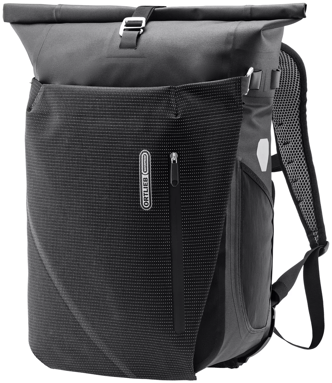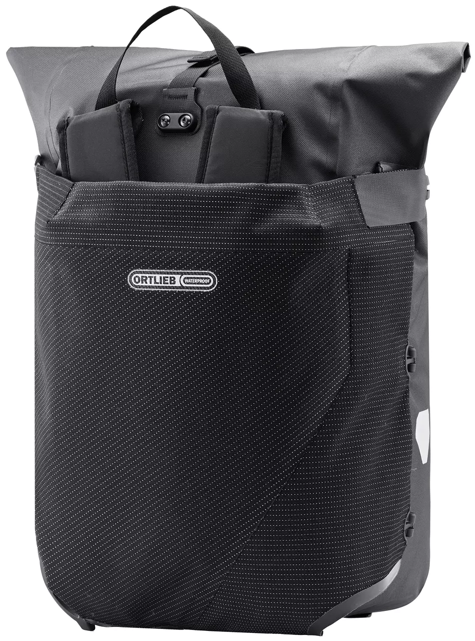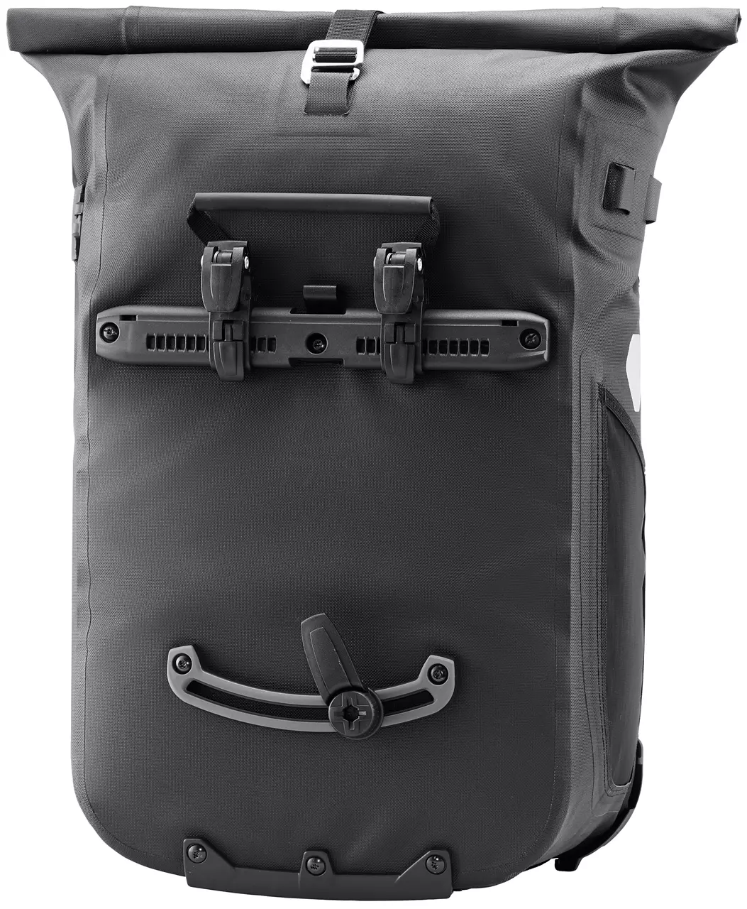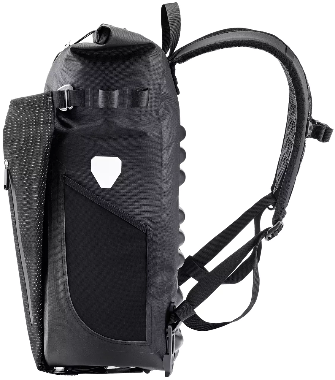 Mit dem Vario PS High Vis QL2.1 baut Ortlieb einen Hybrid aus Rucksack und Fahrradtasche. Die Tasche mit einem Volumen von 26 Litern hat auf der einen Seite die bewährte QL2.1-Aufhängemechanik, mit der sie stabil am Gepäckträger befestigt wird. Hat man das Ziel erreicht, wird die flexible Front einfach über die Hakenleiste geschlagen und auf der freigewordenen Seite kommen Schultergurte zum Vorschein. Damit lassen sich dann die Wege in der Stadt komfortabel bewältigen. Der „Umbau“ geschieht in wenigen Augenblicken und geht intuitiv von der Hand. Optimal für die urbane Nutzung ist der Vario PS High Vis QL2.1 mit einem Laptopfach ausgestattet, in der Geräte von max. 36 x 24,5 x 2,5 cm einen sicheren Platz finden. Außerdem ist der Flap durchgehend mit Reflexgarnen gearbeitet. Wird die Tasche von einem Autoscheinwerfer angeleuchtet, wird sie dadurch zum großflächigen Reflektor. Eine Netzaußentasche und eine Reißverschlusstasche, die in die Wendefront eingelassen ist, komplettieren die Ausstattung. Der Rollverschluss ermöglicht eine variable Anpassung des Rucksackvolumens an den Inhalt. Wie für Ortlieb üblich, ist der Vario PS High Vis QL2.1 natürlich wasserdicht.