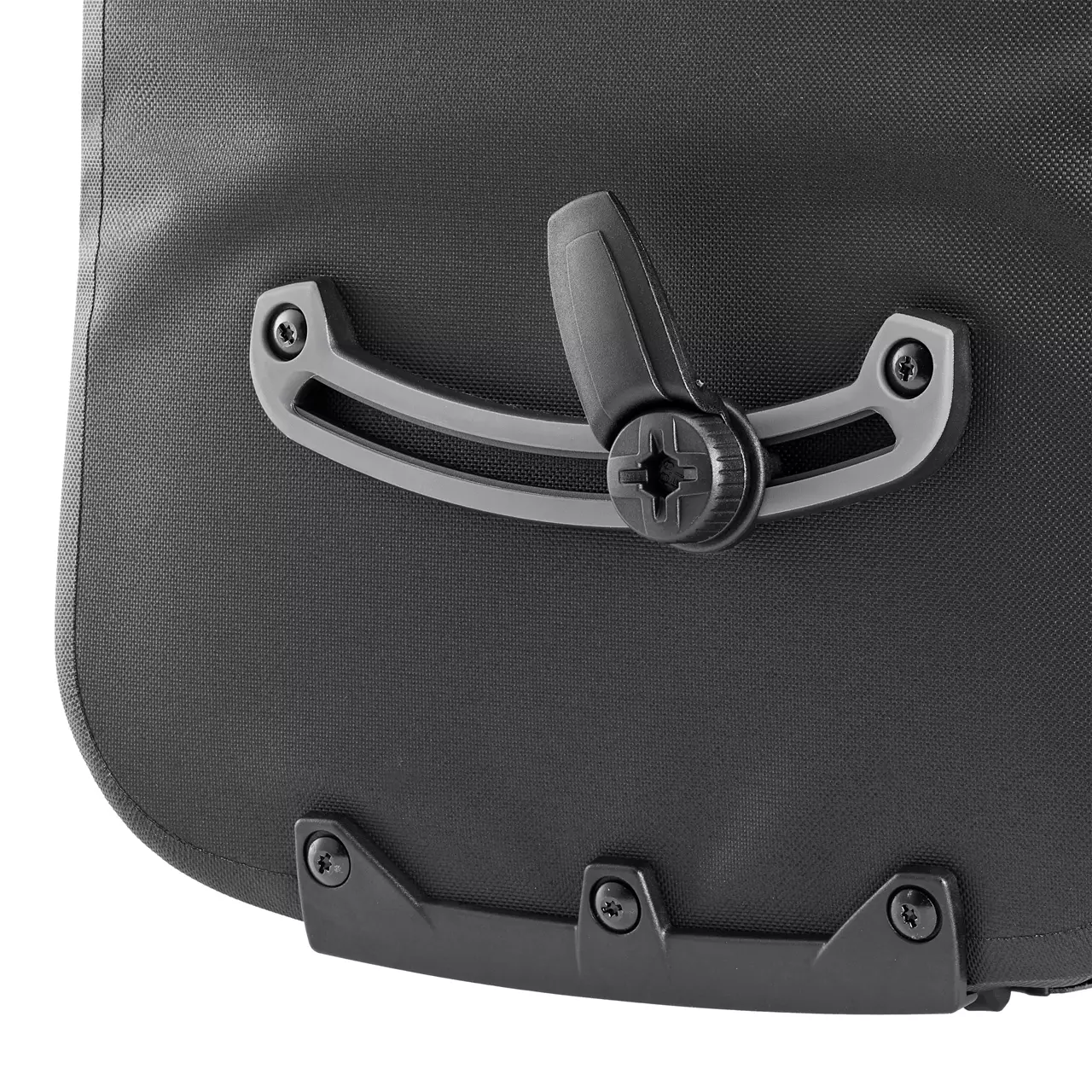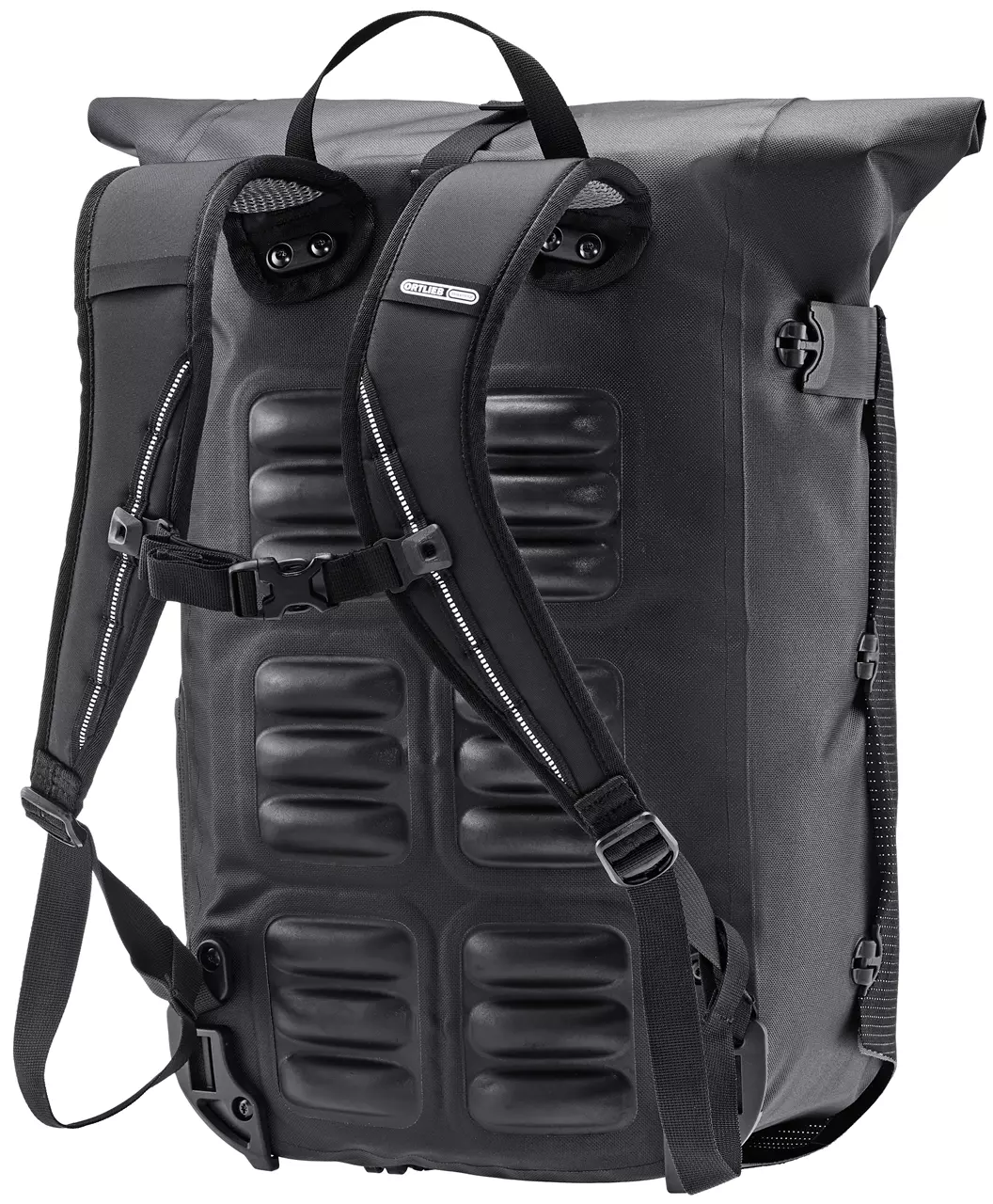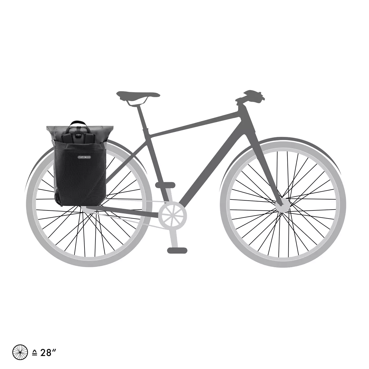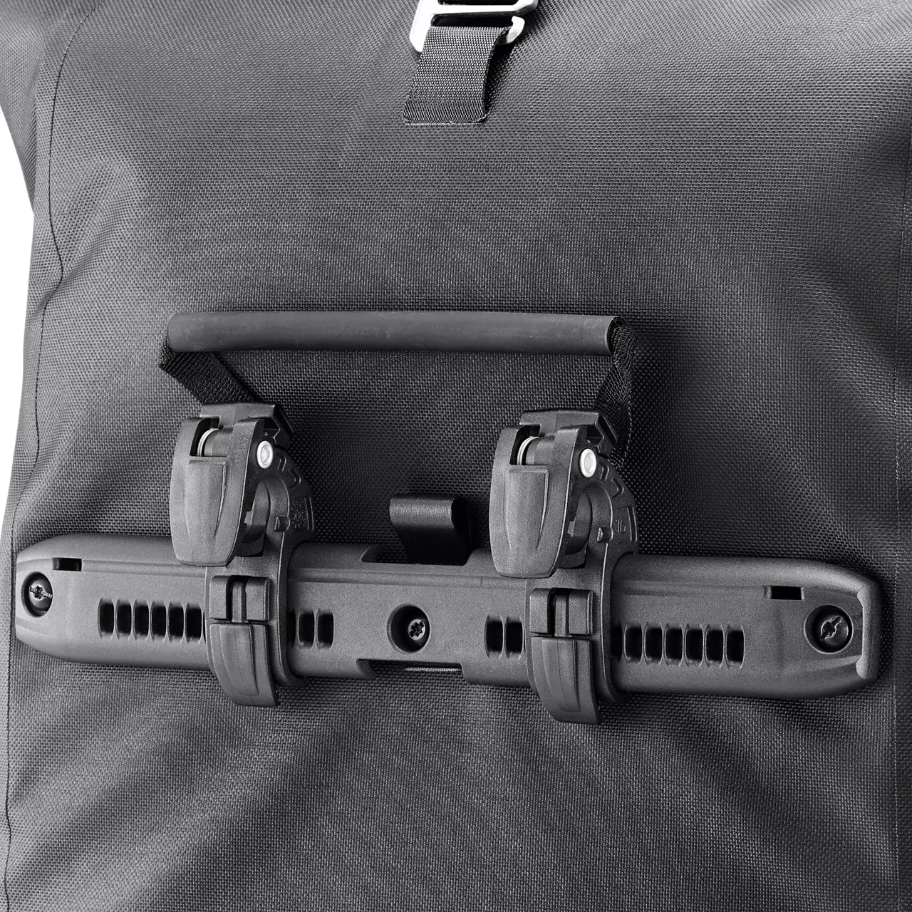 Mit dem Vario PS High Vis QL2.1 baut Ortlieb einen Hybrid aus Rucksack und Fahrradtasche. Die Tasche mit einem Volumen von 26 Litern hat auf der einen Seite die bewährte QL2.1-Aufhängemechanik, mit der sie stabil am Gepäckträger befestigt wird. Hat man das Ziel erreicht, wird die flexible Front einfach über die Hakenleiste geschlagen und auf der freigewordenen Seite kommen Schultergurte zum Vorschein. Damit lassen sich dann die Wege in der Stadt komfortabel bewältigen. Der „Umbau“ geschieht in wenigen Augenblicken und geht intuitiv von der Hand. Optimal für die urbane Nutzung ist der Vario PS High Vis QL2.1 mit einem Laptopfach ausgestattet, in der Geräte von max. 36 x 24,5 x 2,5 cm einen sicheren Platz finden. Außerdem ist der Flap durchgehend mit Reflexgarnen gearbeitet. Wird die Tasche von einem Autoscheinwerfer angeleuchtet, wird sie dadurch zum großflächigen Reflektor. Eine Netzaußentasche und eine Reißverschlusstasche, die in die Wendefront eingelassen ist, komplettieren die Ausstattung. Der Rollverschluss ermöglicht eine variable Anpassung des Rucksackvolumens an den Inhalt. Wie für Ortlieb üblich, ist der Vario PS High Vis QL2.1 natürlich wasserdicht.