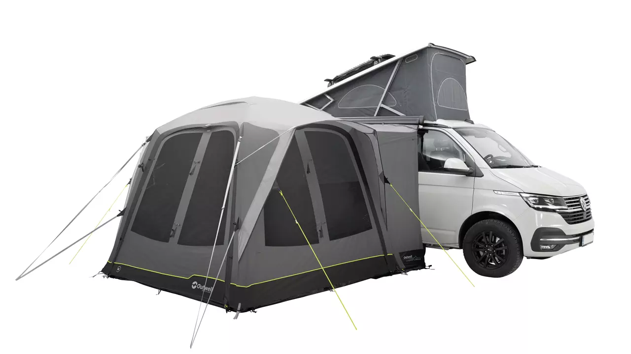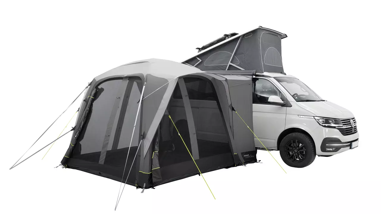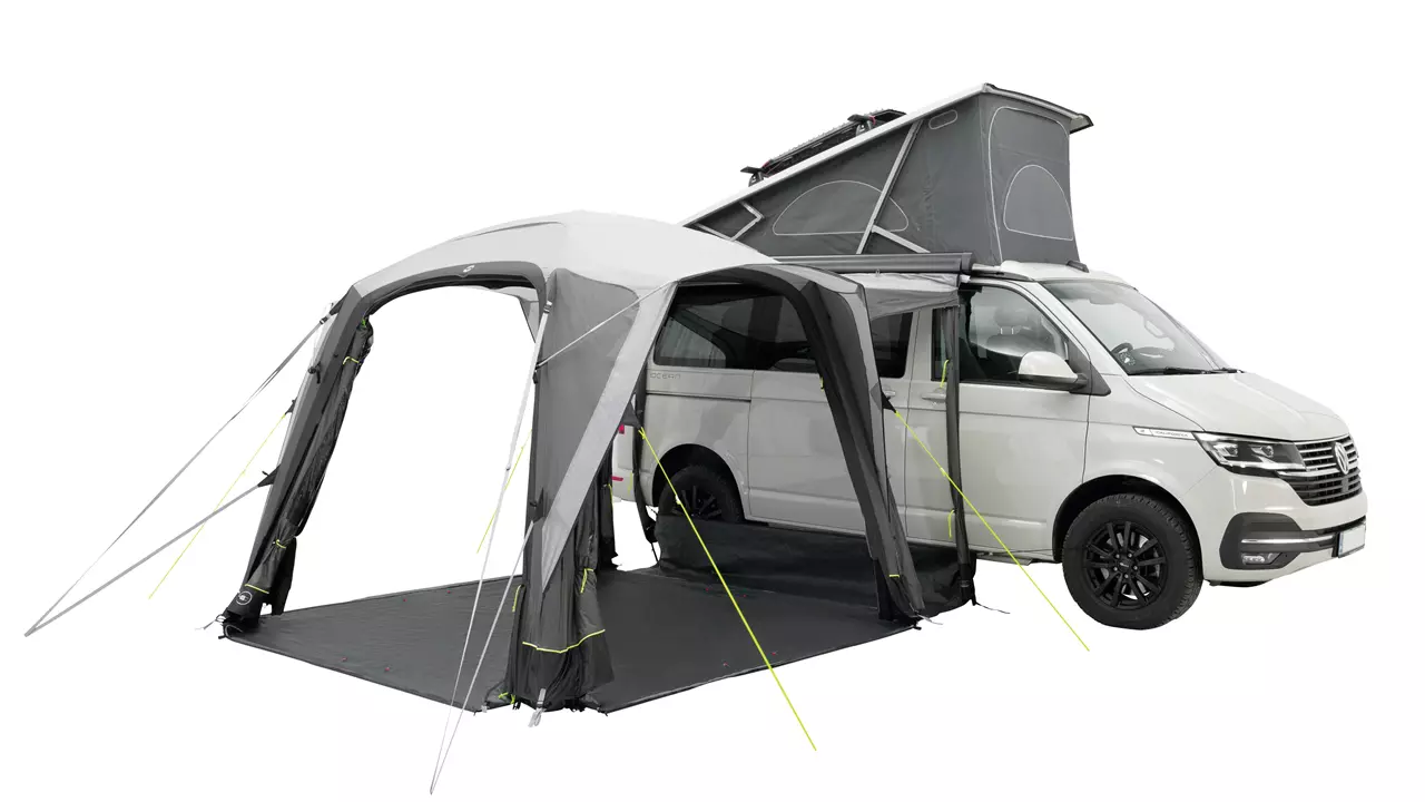 Auto-Salon. Das Outwell Bremburg Air ist ein sehr komfortables Vorzelt zum seitlichen Andocken an Campingbusse der Klasse VW T6. Der Komfort beginnt bereits beim Aufbau: Die Luftschläuche der Kuppelkonstruktion kannst Du in wenigen Minuten über ein gemeinsames Ventil aufpumpen. Mit Hilfe der integrierten Keder (5 mm und 7 mm) ist das Outwell Bremburg Air ebenso rasch am Auto befestigt. Die Schleuse zwischen Aufenthaltsraum und Bus kann durch zwei gegenüberliegende Türen betreten werden, was Dir einen unkomplizierten Zugang sowohl zum Fahrzeug als auch zum Zelt ermöglicht. Der Boden des Outwell Bremburg Air ist fest mit diesem verbunden und darum bereits automatisch nach dem Aufpumpen aufgespannt. Angenehm wohnen kannst Du im Outwell Bremburg Air bei allen Wetterverhältnissen: Bei Regen und Wind schützen Dich die dauerhaft dichten Außenzeltmaterialien, zu viel Sonne mildern die getönten Folienscheiben ab, bei Hitze kannst Du die Wände komplett beiseite rollen und Dich nur vom Dach des so entstandenen Pavillons beschatten lassen und wenn dann in der Dämmerung Insekten drohen, schließt Du die Wände ganz einfach mit großflächigen Moskitonetzen. Selbstverständlich hat Outwell das Bremburg Air so konstruiert, dass Du es schnell vom Campervan lösen und verschlossen auf dem Zeltplatz zurücklassen kannst, wenn ein Spritztour mit dem Bus ansteht.
