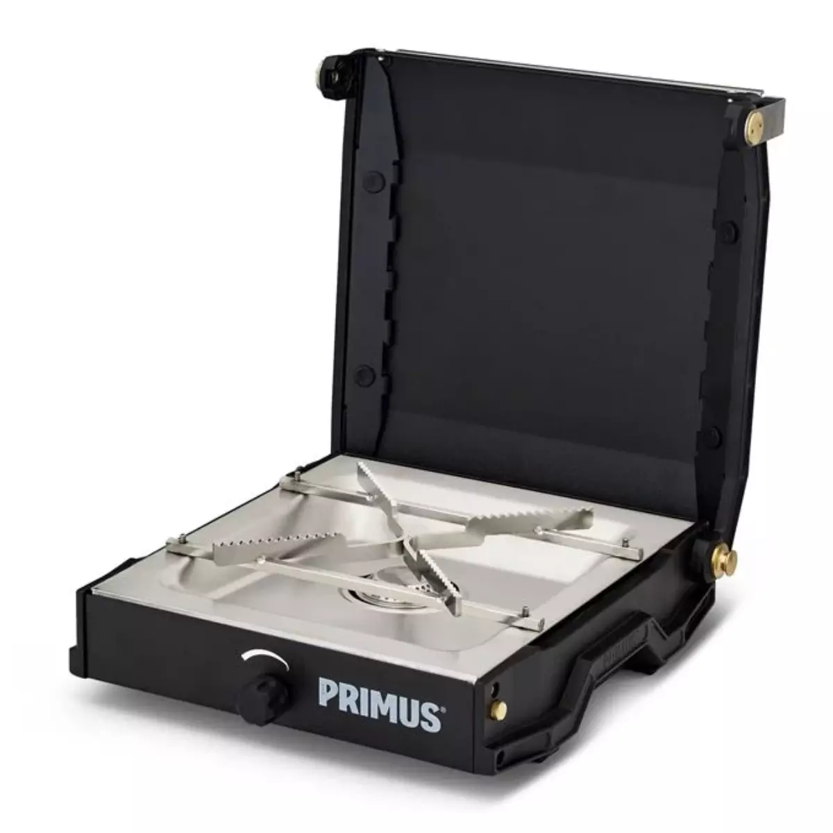 Der Einflammenkocher Moja von Primus kann gut transportiert werden und ist gleichzeitig robust genug für größere Töpfe. Zusammengeklappt sieht man ihm den Kocher gar nicht an. Der holzbeschichtete Griff und das dunkle Aliminiumgehäuse sehen sehr edel aus. Aufgeklappt überzeugt der Moja mit schlichter Eleganz, absoluter Praktiikabilität und 3000 Watt Leistung. Die Topfauflage garantiert auch großen Töpfen eine sicheren Stand und ist zudem, genau wie die Tropschale, herausnehmbar, um sich gut reinigen zu lassen. Sollten die Pfannen und Töpfe mal größer werden, als der Moja samt Deckel Raum gibt, dann wird der Deckel des Campingkochers einfach abgemacht und schwupp, schon ist genügend Platz zum Arbeiten da. Der kraftvolle 3.000-W-Brenner mit präziser Flammensteuerung ermöglicht das Kochen und Braten mit genau der richtigen Hitzezufuhr mit allen Gaskartuschen, die ein Lindalgewinde haben. Der lange Gasschlauch hilft beim standortunabhängigen Betreiben des Gaskochers. Für den deutschen Markt ist der DIN Combi Adapter im Lieferumfang inbegriffen.